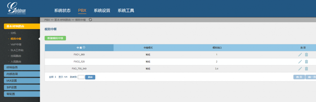 因为电信开通的固话是光猫那边直接输出的,首先需要设置的是模拟中继,如上图;