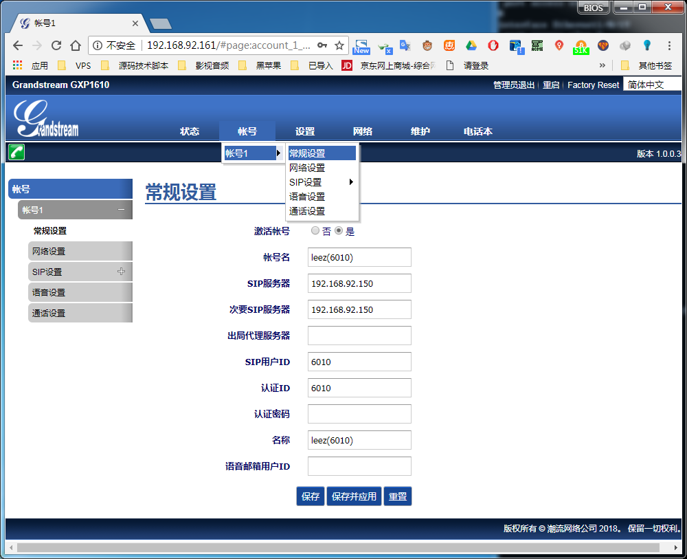点击账号,常规设置,把你之前创建的分机号信息填进去保存并应用;SIP服务器地址就是你的IPPBX设备的IP地址,6010就是之前创建的设备分机号;