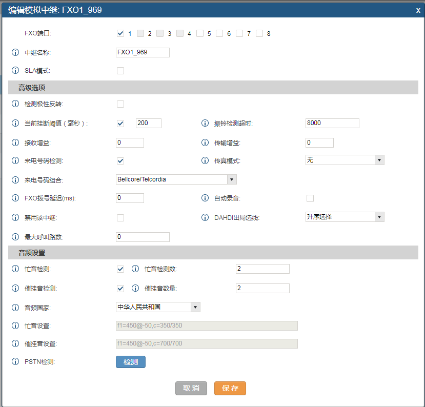新建中继配置文件,勾选相对应的FXO接口,参数如上;