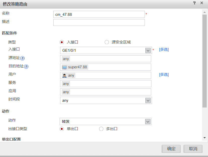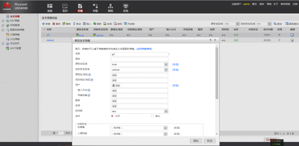 不做其他限制,配置trust(内网)到untrust(外网)的数据转发请求;