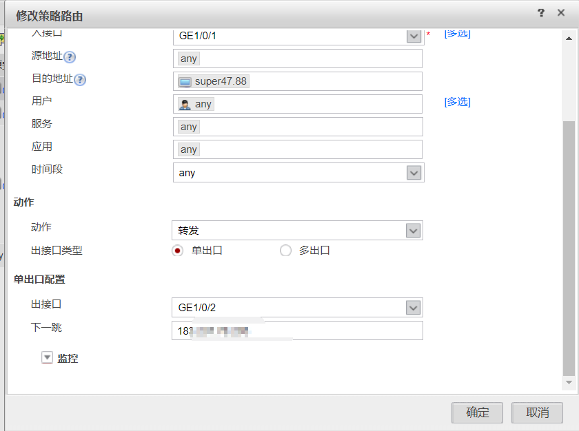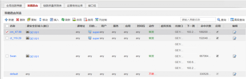 其实默认的那条策略可以编辑掉,但由于博主太懒,以上的策略越靠近顶部优先级越高;以上策略的大意如果访问47.88这个ip,则从移动链路出去,如果访问119.92这个ip,则从电信链路出去,配置参数如最后两个图,您也可以根据自身需求变更为多出口,设置好出口优先级即可,最后记得保存!