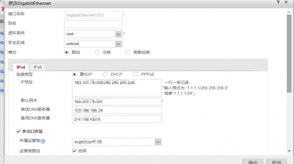 网络连接方式根据需求设置,勾选多运营商出口,运营商路由可选可不选,反正后面能做转发策略,