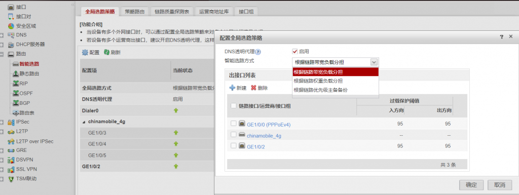 负载均衡有几种方式,可根据具体需求配置,这里博主选择 根据链路带宽负载分担 出接口列表选择你的外网出口,关于chinamobile_4g这个接口组,可以在上个选项卡的接口组进行自定义;