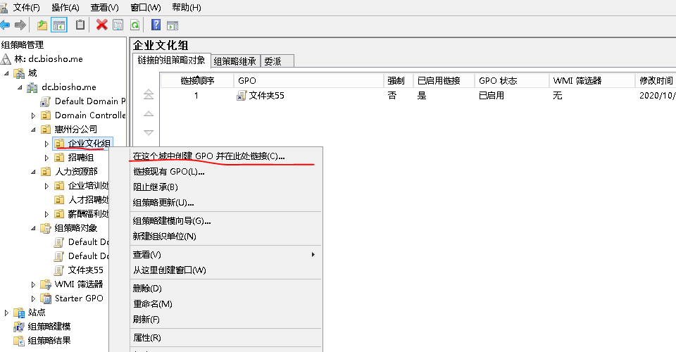 右击你要推送GPO策略的组织单位,创建GPO规则(上图文件夹55是已经创建过的请忽略)