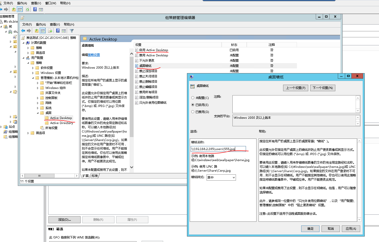 打开用户配置—-管理模板—-桌面—-Active Desktop—-启用Active Desktop,启用桌面墙纸选项,填入你要推送的壁纸路径,注意权限开放,确定即可。