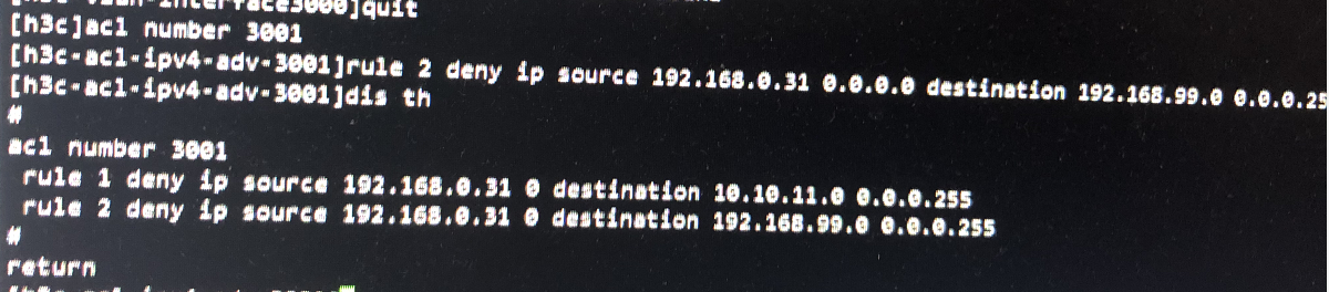 目标 IP:192.168.0.31位于vlan3000段,禁止此ip访问10.10.11.01/24和192.168.99.0/24(规则内子网掩码要转换成通配符,/24转换成0.0.0.255,/32转换成0.0.0.0)